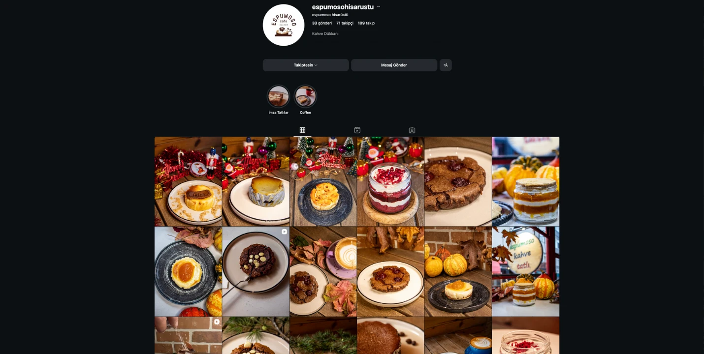 Espumoso Hisarüstü’nün Instagram hesabında içerik akışını daha düzenli ve hedef odaklı ilerletmek için planlama ve yayın süreçlerini yönettim. Ürün/menü odaklı paylaşımlarda metin dili, etkileşim çağrıları ve kampanya duyurularını tutarlı bir çizgide kurguladım.